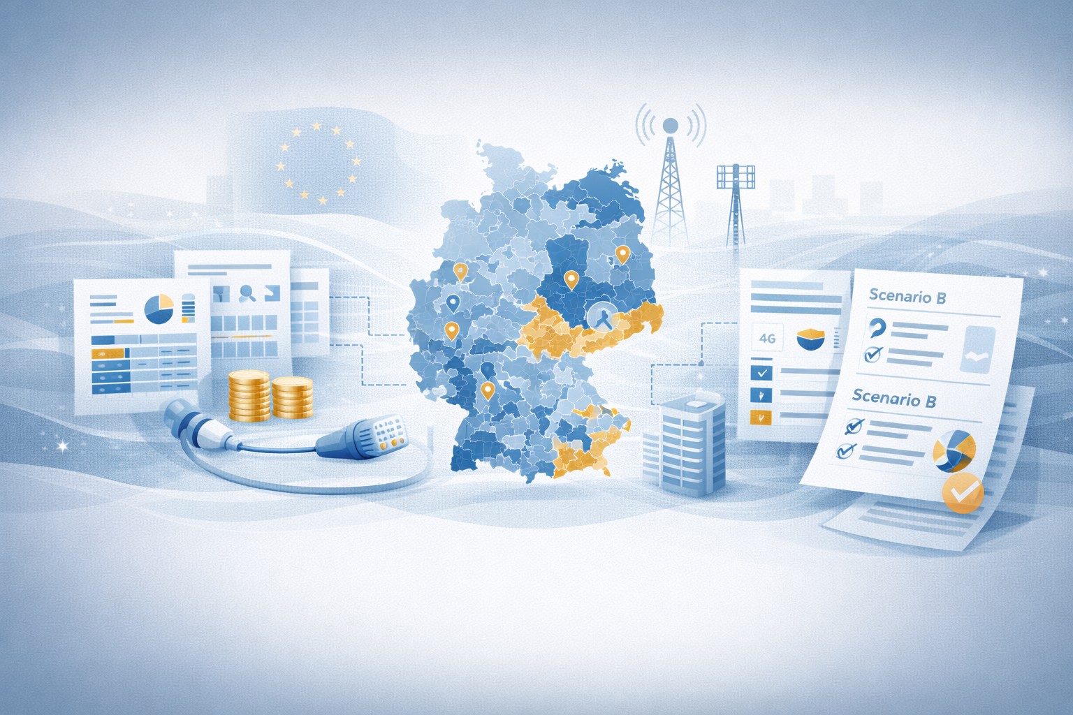 Aktualisierung einer veralteten Wettbewerbssicht und Überführung in eine belastbare Clusterlogik für den Target Addressable Market. Dazu wurden Wettbewerb, Förderstatus sowie FTTB/COAX-Abdeckung auf Gemeindeebene geprüft, Ausschlussregeln abgestimmt und eine automatisierte Clusterbildung für Deutschland aufgebaut. Ergebnis waren konsistente TAM-Cluster inkl. GIS-/Excel-Datenbasis und Management-Übersichten als Grundlage für priorisierte Ausbauentscheidungen.