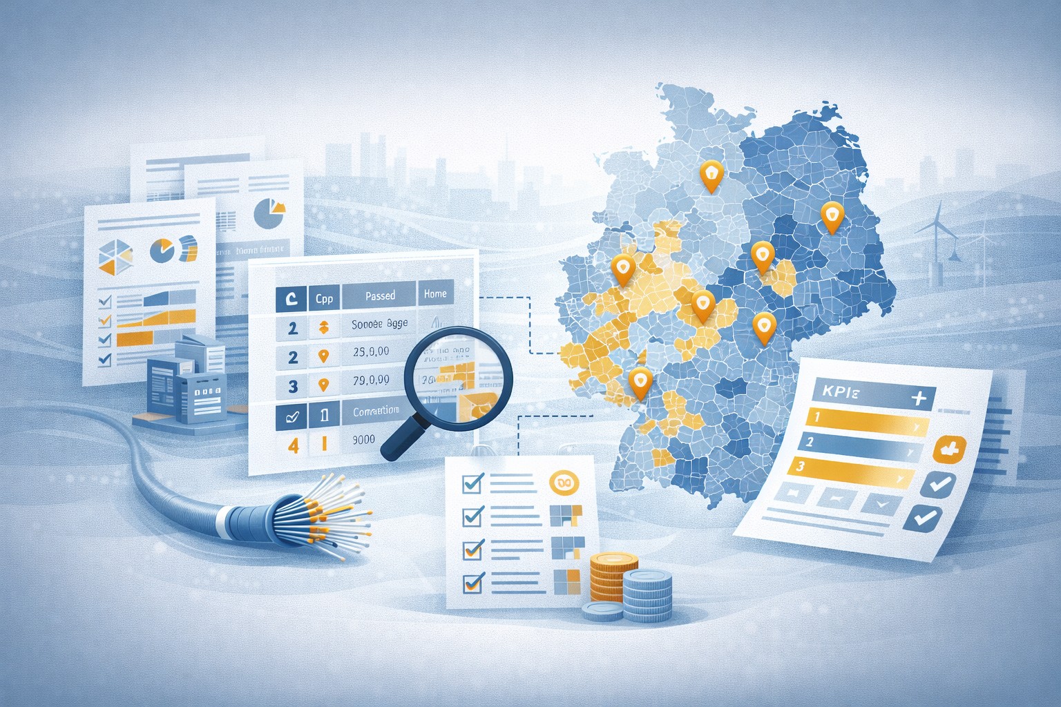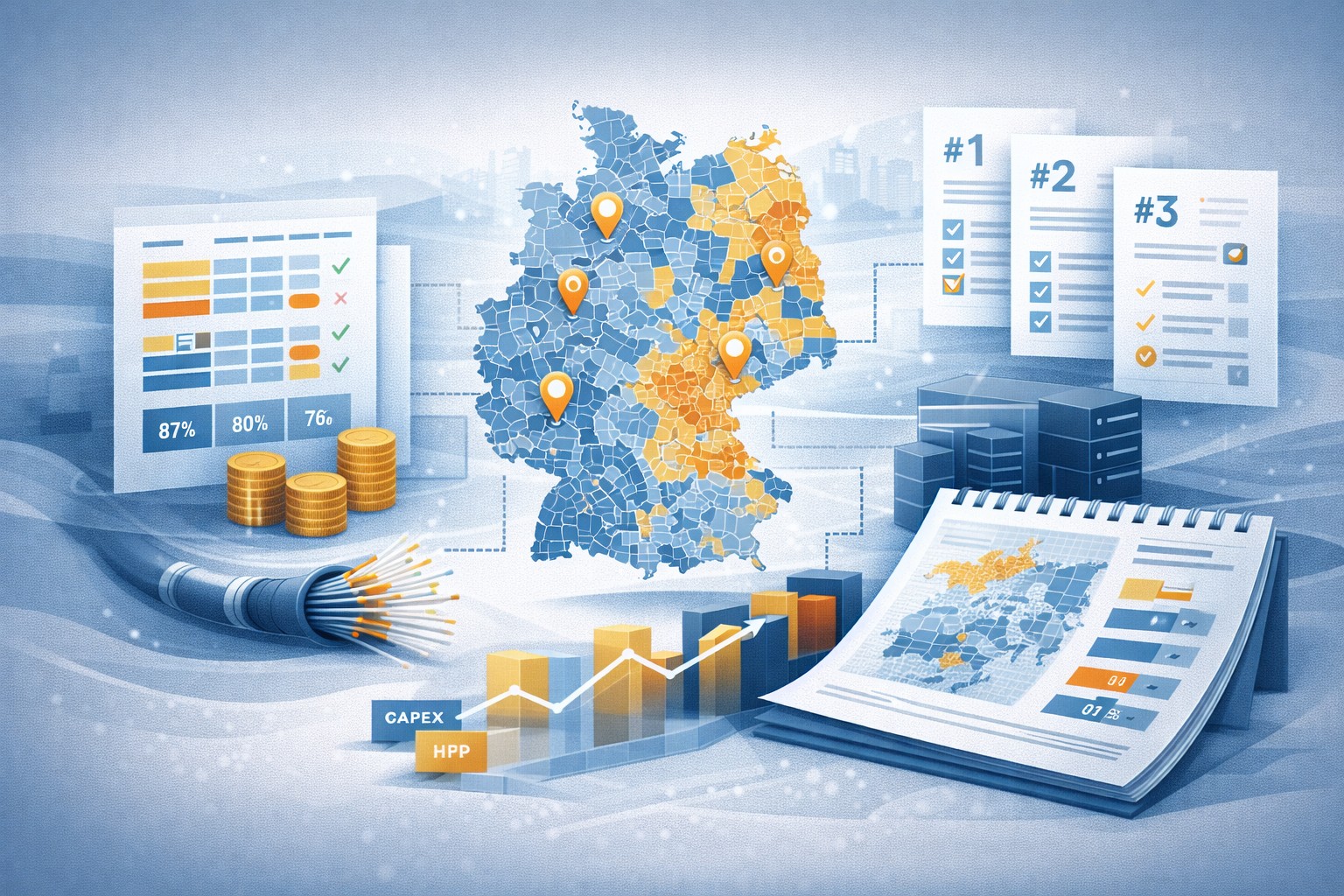 Ableitung einer priorisierten Clusterliste als Grundlage für Kooperationen und Verhandlungen mit einem großen ISP. Potenziale wurden bis auf Substruktur/HP-Ebene betrachtet, Ausschlusslogiken (Abdeckung/Wettbewerb/Förderung) definiert und CAPEX/HP-Bewertungen integriert. Die Clusterbildung erfolgte entlang definierter Parameter und wurde per KPI-Logik gerankt. Ergebnis: konsistente TAM-/GIS-Datensätze und ein Management-Booklet als Diskussionstarter für Ausbau- und Verhandlungsentscheidungen.